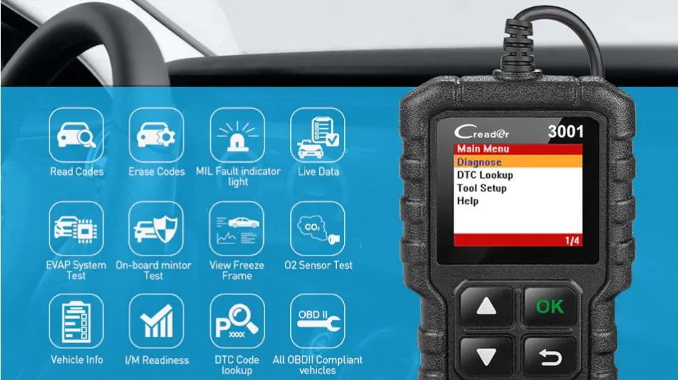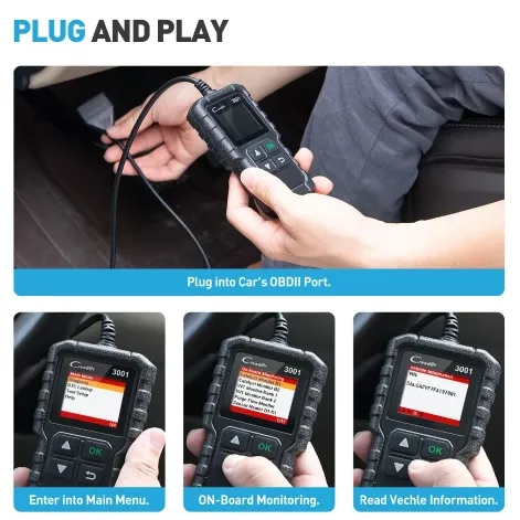 CReader 3001 dispune de funcții complete de diagnosticare OBDII / EOBD și este compatibil cu protocoale precum ISO9141-2, ISO14230-4, SAEJ1850 și ISO15765-4.