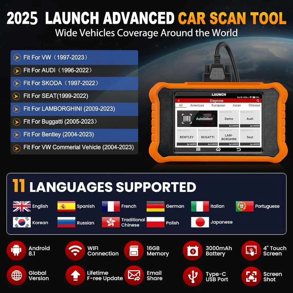 Launch X431 Creader Elite VAG (pentru VW, Audi, Seat, Skoda, Bugatti, Bentley, Lamborghini) este un instrument profesional de diagnosticare completă a sistemului, cu peste 31 de funcții de resetare, actualizări gratuite pe viață, codare ECU online și offline și teste active. Doar pentru autoturisme cu tensiune a bateriei de 12 V!