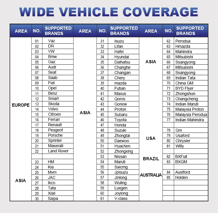 (JAPONIA) Acura, Daihatsu, Honda, Infiniti, Isuzu, Jpisuzu, Lexus, Mazda, Mitsubishi, Nissan, Nissan GTR, Scion, Subaru, Suzuki, Tlisuzu, Toyota, (COREEA) Daewoo, Hyundai, KIA, Samsung, Ssangyong, (CHINA) Baic, Beijing, Changan, Changan-Ford, Changcheng, Changhe, Chsuzuki, DF Peugeot, DF Honda, DF Nissan, DF XK, Flyer, BYD, Fukang, Futian, Foton, Geely, Gonow, GZ Honda, Hafei, Haoqing, HC BMW, Hmada, Huachen, Isuzu, JMC, Jacty, Jianghuai, Jiao, Jinlong, Joylong, Lifan, Liuwel-TY, Luxgen, NJ Fiat, Qirul-TY, Chery, Qoros, Saicmg, Spark-TY, TJ Toyota, Trumpchi GAC, Weili, Xiaokang Dongfeng, Xili, Faw Tianjin, Xinkai, YQ Mazda, Zhongshun, Zhongtai, Zotye, Zhongxing, (INDIA) Mahindra, Maruti, Tata, (MALAESIA) Perodua, Proton, (IRAN) MVM
