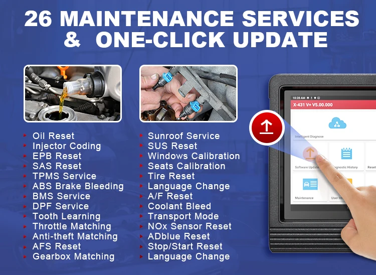 Software-ul și programul Launch X431 sunt actualizate continuu și au fost adăugate funcții suplimentare: instalare faruri, ajustare scaune, studiu de inițializare a ușilor și ferestrelor, inițializare trapă, ajustare suspensie pneumatică, ajustare transmisie, calibrare injector, resetare video multimedia, resetare cluster, întreținere imobilizator, resetare schimbare anvelope (în funcție de modelul de mașină, nu pentru toate mașinile).