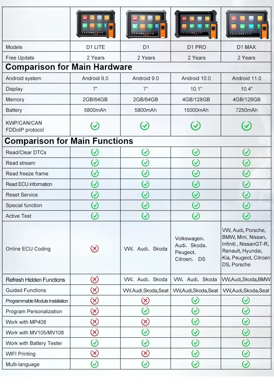 Pe lângă unitatea motorului, sunt suportate și transmisii automate, ABS, airbaguri, tabloul de bord și alte unități ale mașinii. Dispozitivul are o baterie încorporată cu o capacitate de 5800 mAh. Prețul dispozitivului include actualizări timp de 1 an.