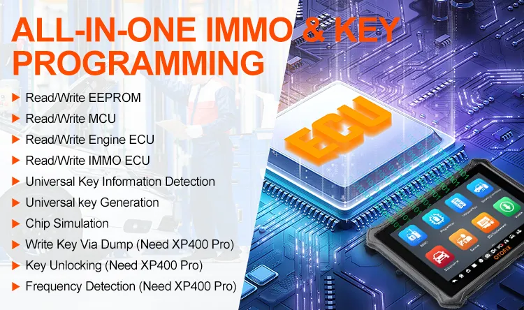 Mod inteligent – învață automat cheile conform vrăjitorului Mod expert – învățarea avansată a cheilor Recunoașterea automată a sistemului – marcă/model/an/sistem Citirea codului PIN/CS – utilizat dacă toate cheile sunt pierdute Codificarea cheii Învățarea telecomenzilor Resetarea/setarea unității imobilizatorului Resetarea/codificarea unității imobilizatorului Backup și restaurare a datelor imobilizatorului Învățarea cheilor și personalizarea unității Mercedes FEM/BDC Adăugarea cheilor (chiar dacă toate cheile sunt pierdute) pentru unitățile VW/Audi/Seat/Skoda IMMO – generațiile III, IV și V