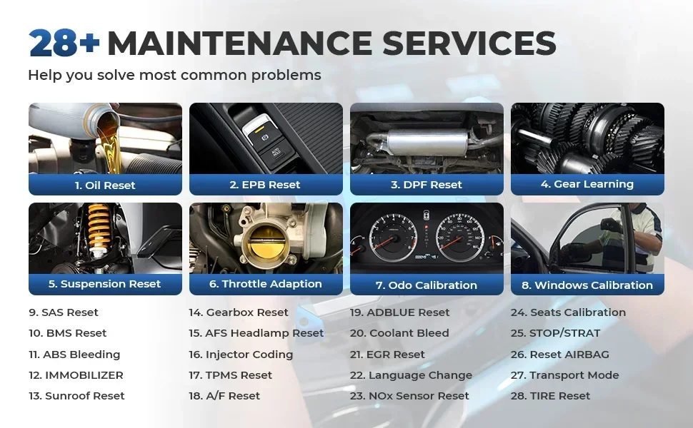 Includes oil reset, EPB reset, DPF regeneration, transmission relearn, suspension calibration, throttle adaptation, odometer calibration, window calibration, and more -